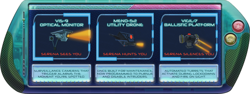 ● Security cameras are Serena’s eyes. Step into their vision and alarms, locks, and worse will follow.